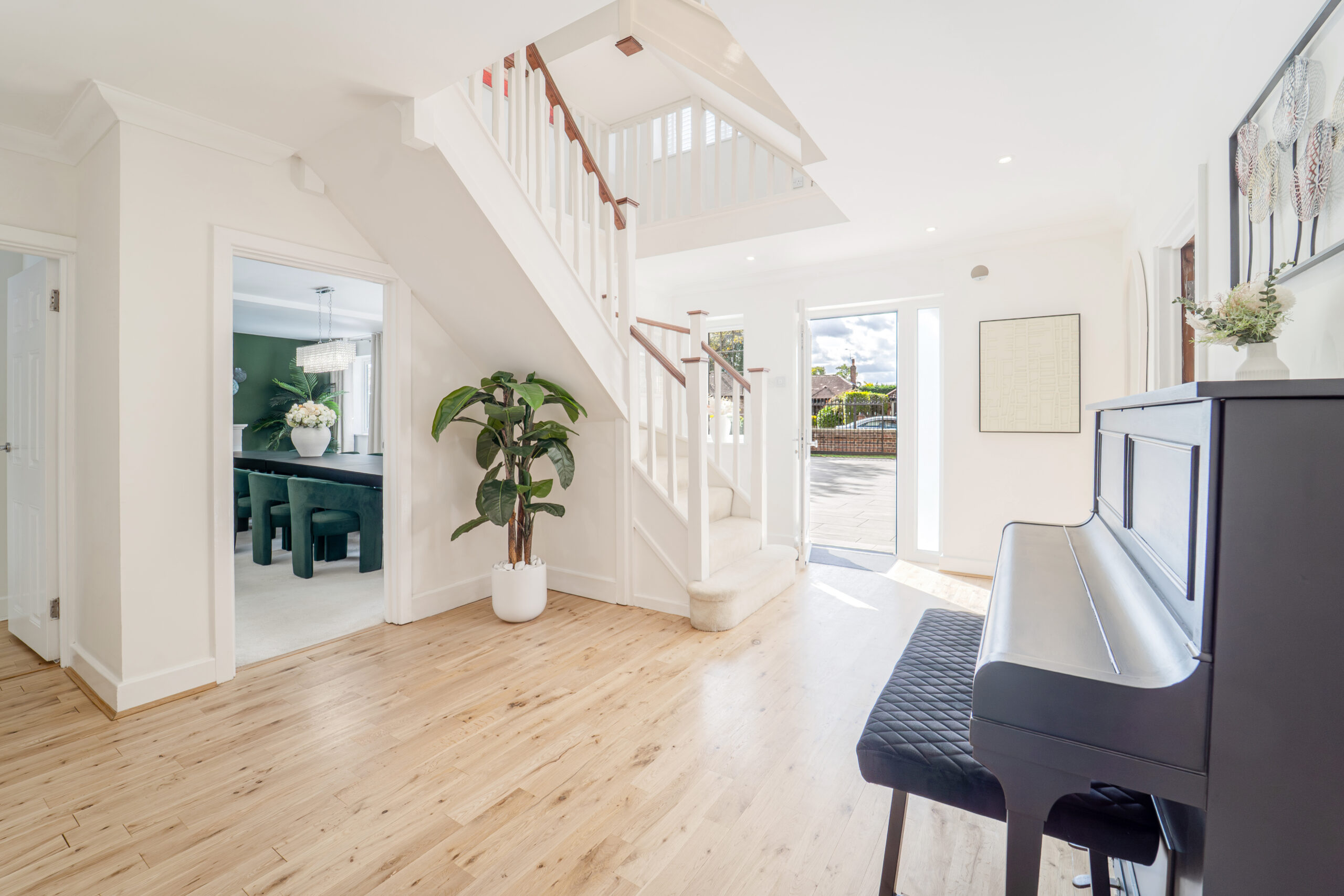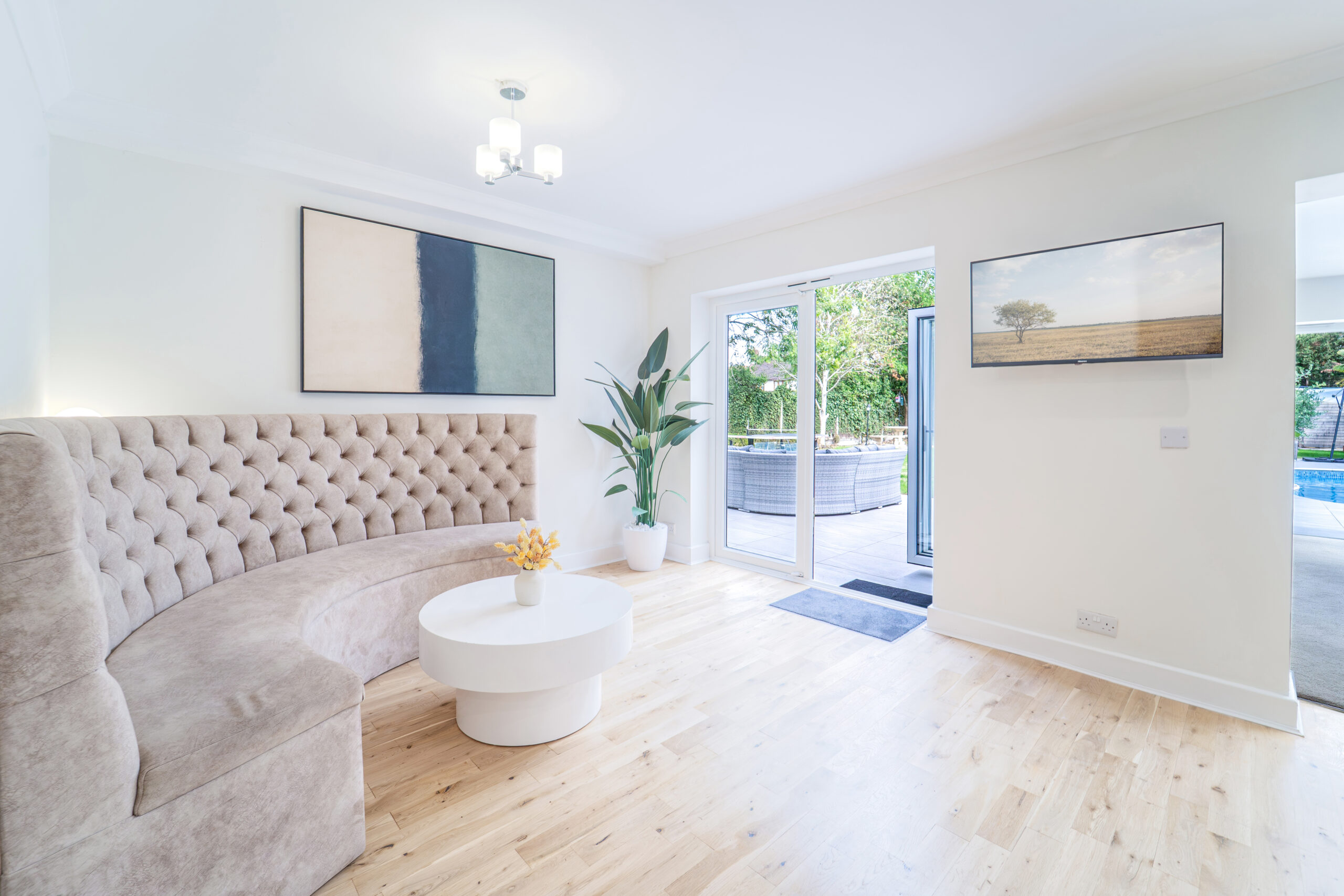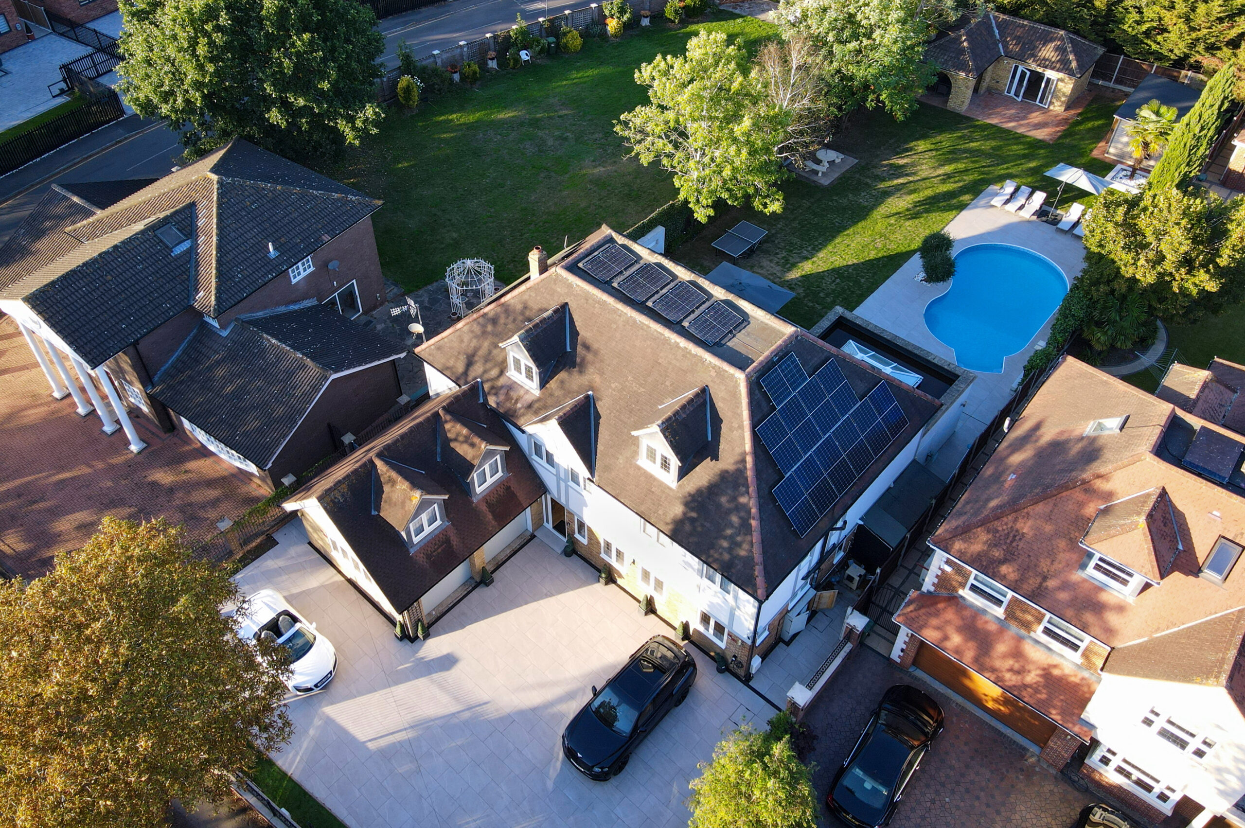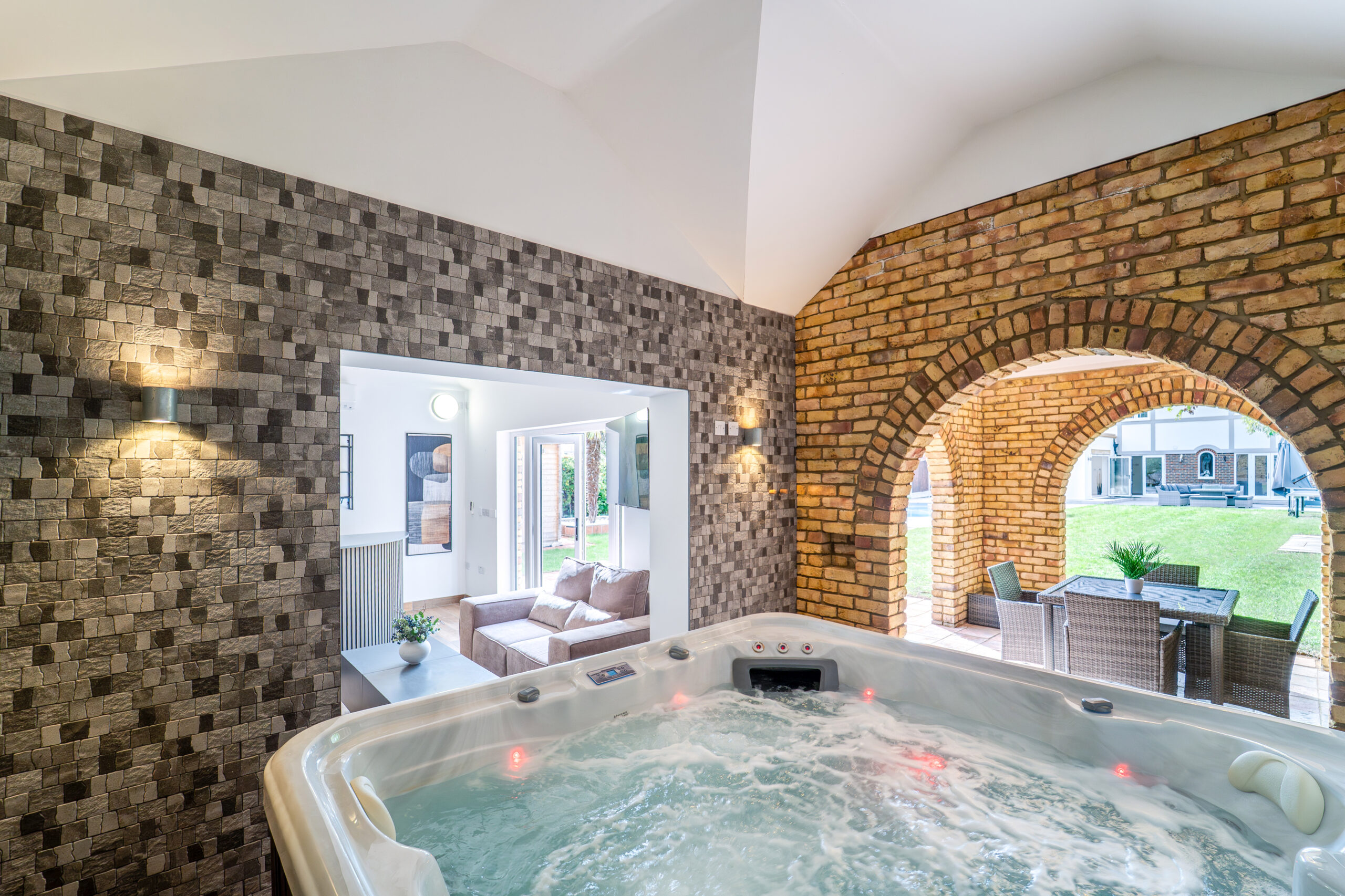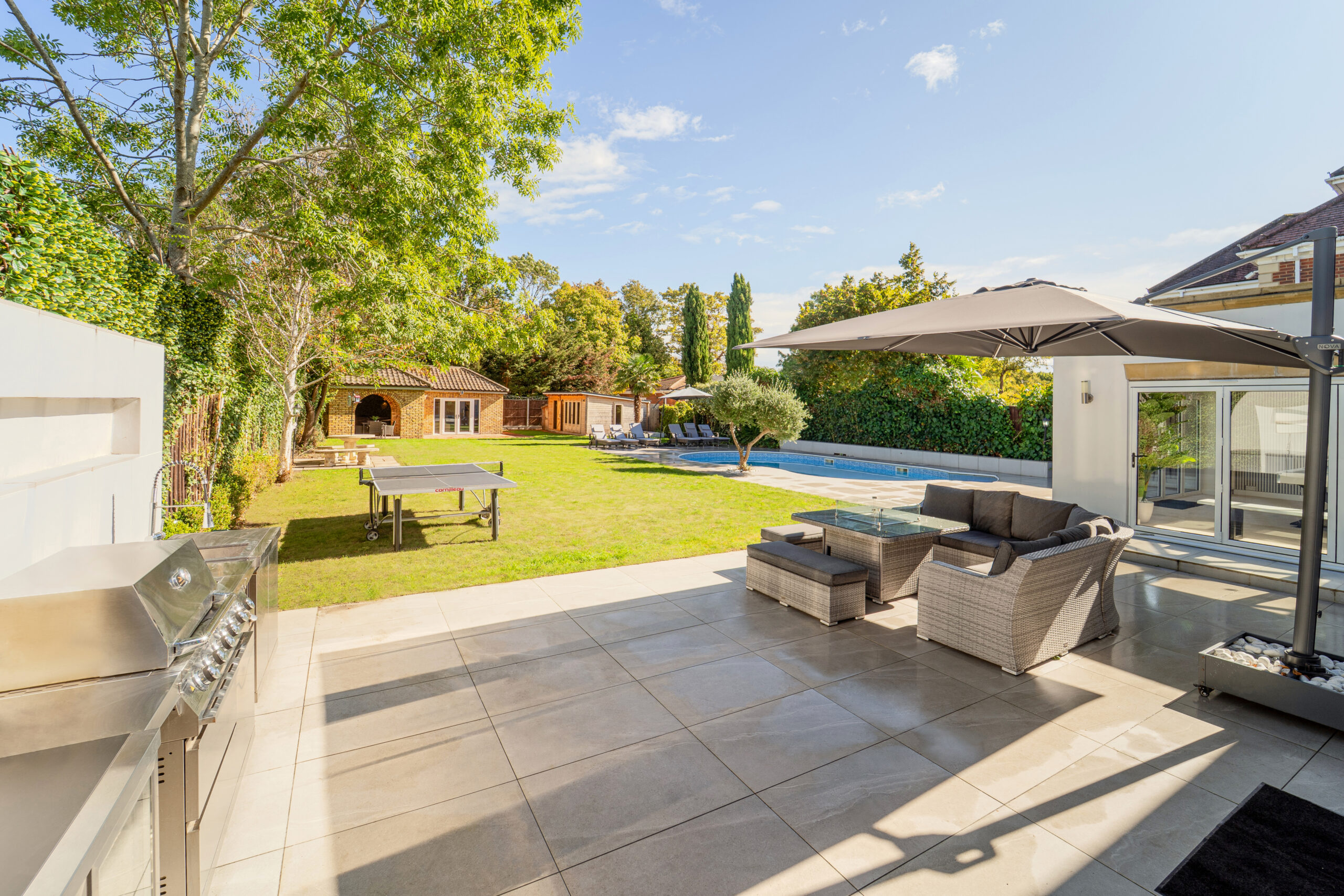 Located in the exclusive Emerson Park area of North East London/Essex, this 5,300 sq ft gated villa offers resort-style living with six bedrooms and five bathrooms, heated pool, jacuzzi, pool house bar, outdoor BBQ kitchen, games room and cinema.